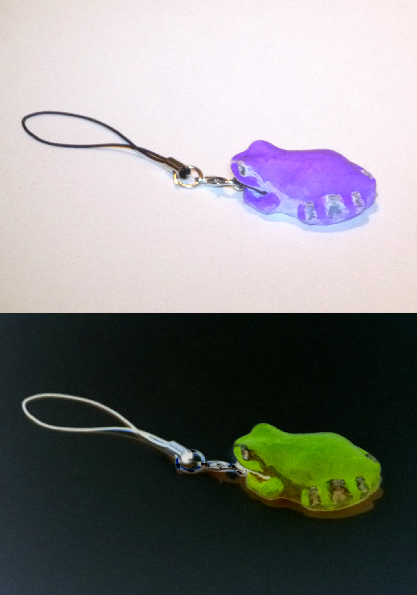 これはネガ着彩のカエル・ストラップです。(上が原色/下が階調反転後)
